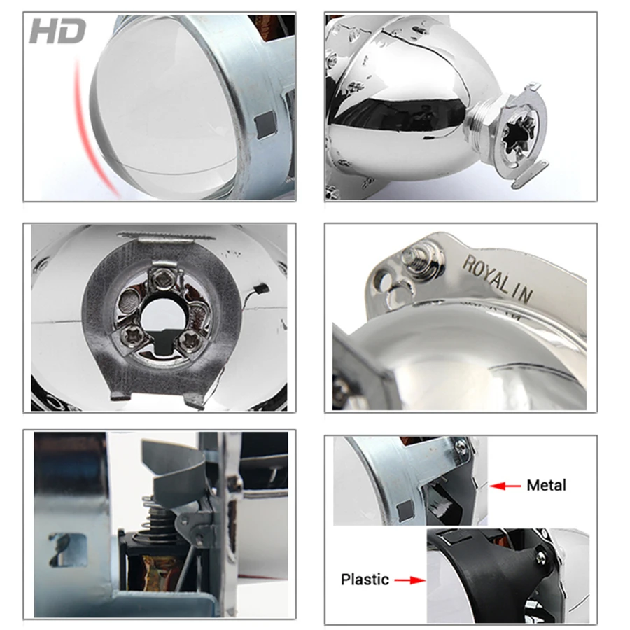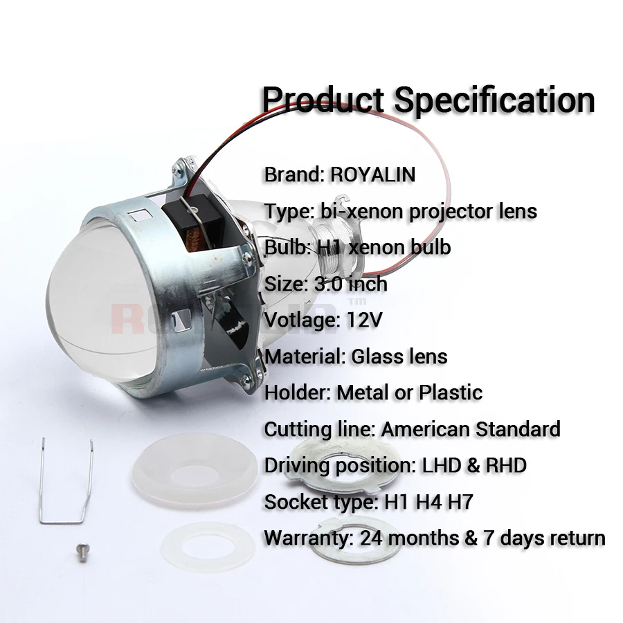 - Product name : ROYALIN Car Metal Headlight Projector H1 Bi Xenon Lens DRL With White LED Round Cover For H4 H7 Mot